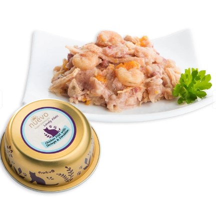 Nuevo Lovely Filets (Куриное филе, креветки) — супер-премиальные консервы для взрослых кошек с куриным филе, креветками, одуванчиком и льняным маслом.