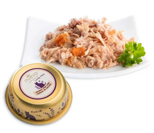 Nuevo Chicken Filet with Salmon & Carrots, 85 г - супер-премиальные консервы для взрослых кошек с куриным филе, лососем, морковью и лососевым жиром.