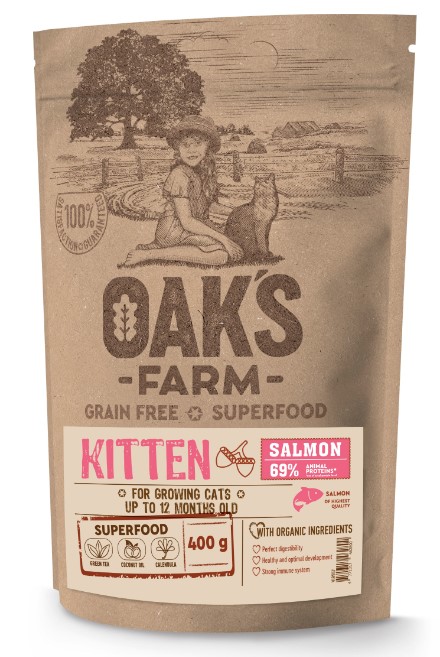 OAK’S FARM Grain Free Salmon Kitten беззерновой корм с лососем для маленьких котят – это полностью сбалансированный, гипоаллергенный корм класса Суперпремиум с суперфудами и органическими ингредиентами. Этот корм предназначен для растущего организма, который требует много энергии.