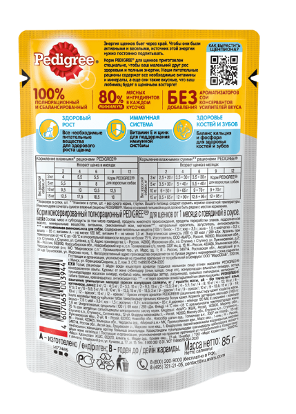 Влажный корм Pedigree для щенков (говядина) приготовлен специально, чтобы Ваш маленький друг рос здоровым и полным энергии. Питательные рационы Pedigree содержат все необходимые витамины и минералы, а еще они такие вкусные, что Ваш любимец будет в щенячьем восторге!