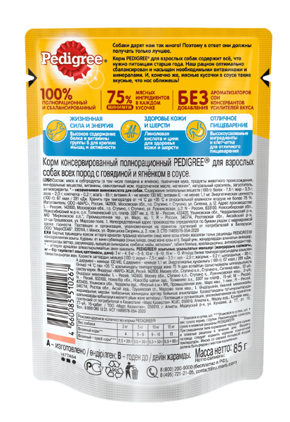 Pedigree Корм консервированный для собак (говядина, ягненок в соусе), 85г