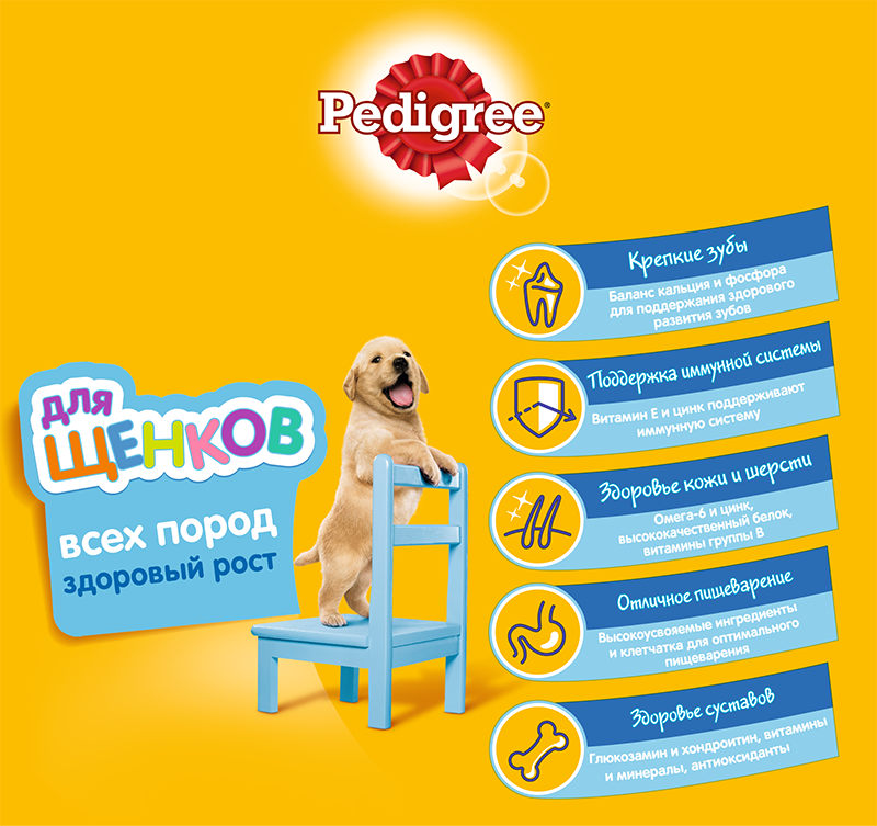 Сухой корм Pedigree для щенков всех пород (курица) создан с учетом потребностей щенков в период наиболее интенсивного роста.