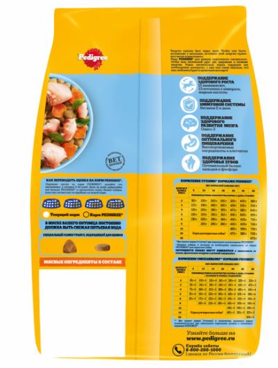Рацион PEDIGREE(R) полнорационный корм с курицей создан с учетом потребностей щенков в период наиболее интенсивного роста. Он состоит из качественных и натуральных ингредиентов: мяса, овощей, злаков. Поэтому PEDIGREE(R) полнорационный корм с курицей способствует здоровому росту и гармоничному развитию вашего малыша. Он также создан с учетом особенностей пищеварения самых маленьких, легко усваивается и обеспечивает правильную работу их желудочно-кишечного тракта.