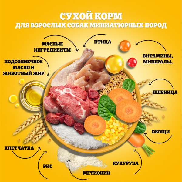 Это полезная и вкусная еда, приготовленная с учетом всех физиологических потребностей взрослых собак маленьких пород.