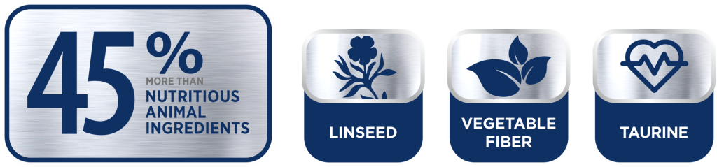 Состав: продукты животного происхождения более 45 % (мясо индейки, дегидратированное мясо птицы и мясопродукты, жир животного происхождения, гидролизат из мяса,) рис, кукуруза и продукты ее переработки, рожь, растительные масла, горошек, льняное семя, люцерна, клетчатка пищевая, морковь, яблоки, шиповник, экстракт одуванчика, экстракт ромашки, экстракт юкки, жом из сахарной свеклы, меланж, мел (источник кальция), дрожжи (источник пребиотиков), таурин, L-лизин, DL-метионин, ферменты, натрия хлорид, калия хлорид, витамины, микроэлементы, антиоксиданты.