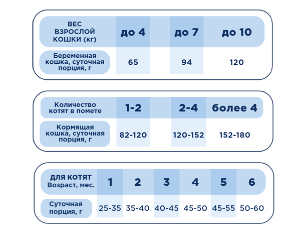 Рекомендации по применению: корм готов к употреблению. Суточная норма может варьироваться в зависимости от индивидуальных потребностей животного. Смотрите таблицу.
