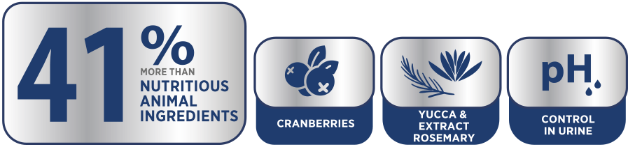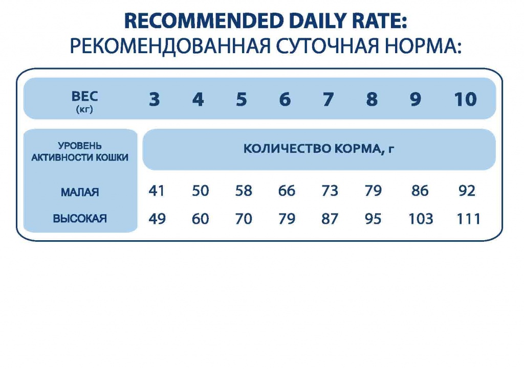 Аналитический состав: белок 30 %, жир 11 %, клетчатка 4,6 %, зола 6,8 %, кальций 1,1 %, фосфор 0,6 %, натрий 0,7 %, калий 0,5 %, Омега-6/Омега-3 не более 5,0 ед., таурин 0,2 %, метионин 0,1 %, триптофан 0,1 %, аргинин 0,4 %, лизин 1,2 %.