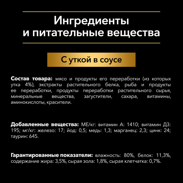 Состав: мясо и продукты его переработки (из которых утка 4%), экстракты растительного белка, рыба и продукты ее переработки, продукты переработки растительного сырья, минеральные вещества, загустители, сахара, витамины, аминокислоты.