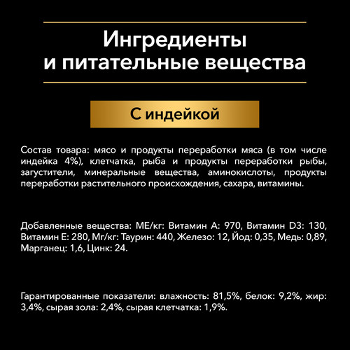 Состав: мясо и продукты переработки мяса (в том числе индейка 4%), клетчатка, рыба и продукты переработки рыбы, загустители, минеральные вещества, аминокислоты, продукты переработки растительного происхождения, сахара, витамины.