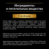 Состав: мясо и продукты переработки мяса (в том числе ягнёнок 4 %), экстракты растительного белка, рыба и продукты переработки рыбы, аминокислоты, продукты переработки растительного сырья, минеральные вещества, растительные масла и животные жиры, загустители, различные сахара, витамины, красители.