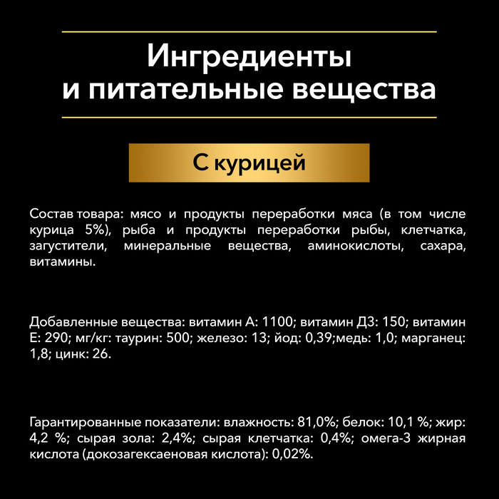 Состав: мясо и мясные ингредиенты (в том числе курица 10%), рыба и продукты переработки рыбы, клетчатка, загустители, минеральные вещества, аминокислоты, сахара, витамины.
