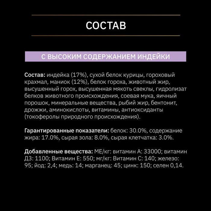 Состав: индейка (17%), сухой белок курицы, гороховый крахмал, маниок (12%), белок гороха, животный жир, высушенный горох, высушенная мякоть свеклы, гидролизат белков животного происхождения, соевая мука, яичный порошок, минеральные вещества, рыбий жир, бентонит, дрожжи, аминокислоты, витамины, антиоксиданты(токоферолы природного происхождения).