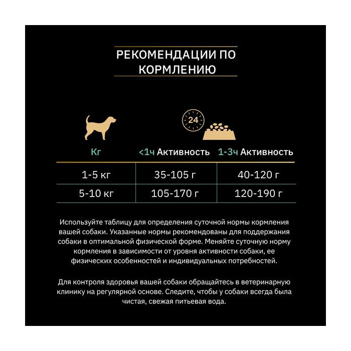 Указанные нормы рекомендованы для поддержания собаки в оптимальной физической форме. Меняйте суточную норму кормления в зависимости от уровня активности собаки, ее физических особенностей и индивидуальных потребностей. Следите, чтобы у собаки всегда была чистая, свежая питьевая вода. Для контроля здоровья вашей собаки обращайтесь в ветеринарную клинику на регулярной основе.