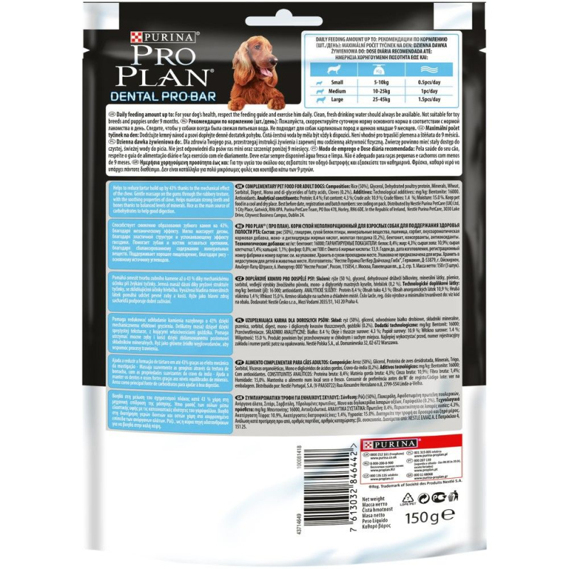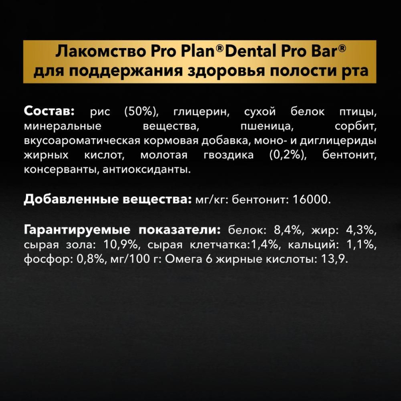 Лакомство Purina PRO PLAN Dental Pro Bar разработано ветеринарными врачами для поддержания здоровья полости рта вашей собаки. Помогает зубам и костям оставаться крепкими благодаря сбалансированному содержанию минералов. Поддерживает правильное пищеварение благодаря рису — основному источнику углеводов.