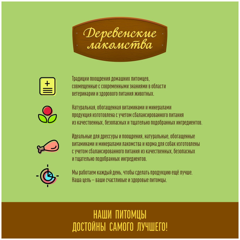 Натуральные лакомства для собак изготовлены с учетом сбалансированного питания из качественных, безопасных и тщательно подобранных ингредиентов. Идеальные для дрессуры и поощрения "Деревенские лакомства" отбираются и обрабатываются вручную и могут служить эталоном лакомств для домашних животных.