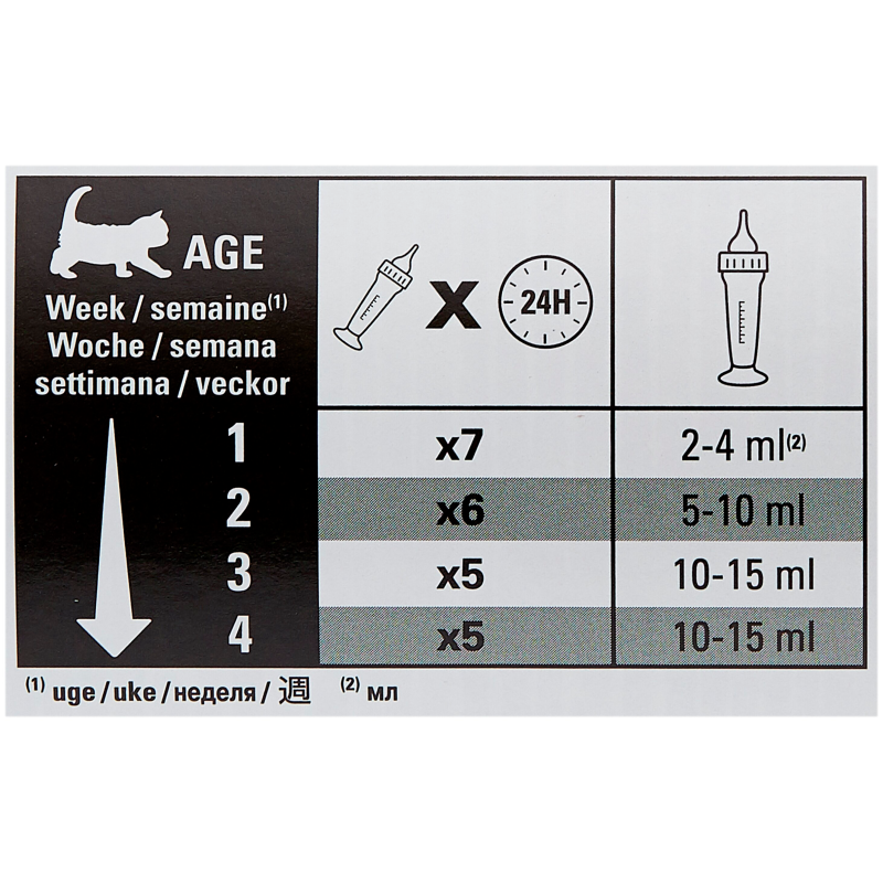 Заменитель обогащен докозагексаеновой кислотой (DHA), которая входит в состав настоящего материнского кошачьего молока.