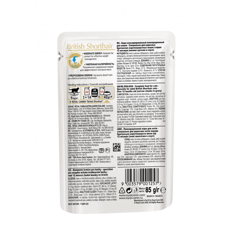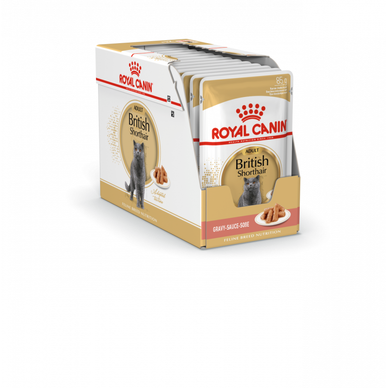 Формула продукта ROYAL CANIN® British Shorthair Adult в соусе идеально отвечает потребностям в питании британских короткошерстных кошек. Представители этой породы, как правило, отличаются мощным, крепким телосложением и имеют развитые мышцы. Именно мышцы, а не жировая ткань в основном формируют массу тела кошки. Поэтому для нее чрезвычайно важен баланс и количество питательных веществ в составе корма.