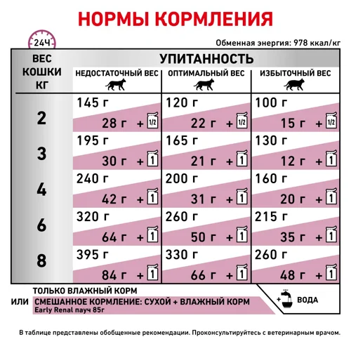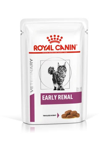 Развитие почечной недостаточности у кошки происходит без видимых симптомов. Поддержать здоровье питомца на ранней стадии развития хронической болезни почек или в случае диагностирования у него риска развития такого заболевания способна правильно подобранная диетотерапия. Продукт Royal Canin Early Renal содержит умеренное количество фосфора, а также Омега-3 жирные кислоты EPA, DHA и комплекс антиоксидантов, которые помогают поддерживать функцию почек при первых признаках недостаточности. Кроме того, специально подобранные питательные вещества, в том числе зеленогубые моллюски, помогают бороться с первыми признаками старения питомца.