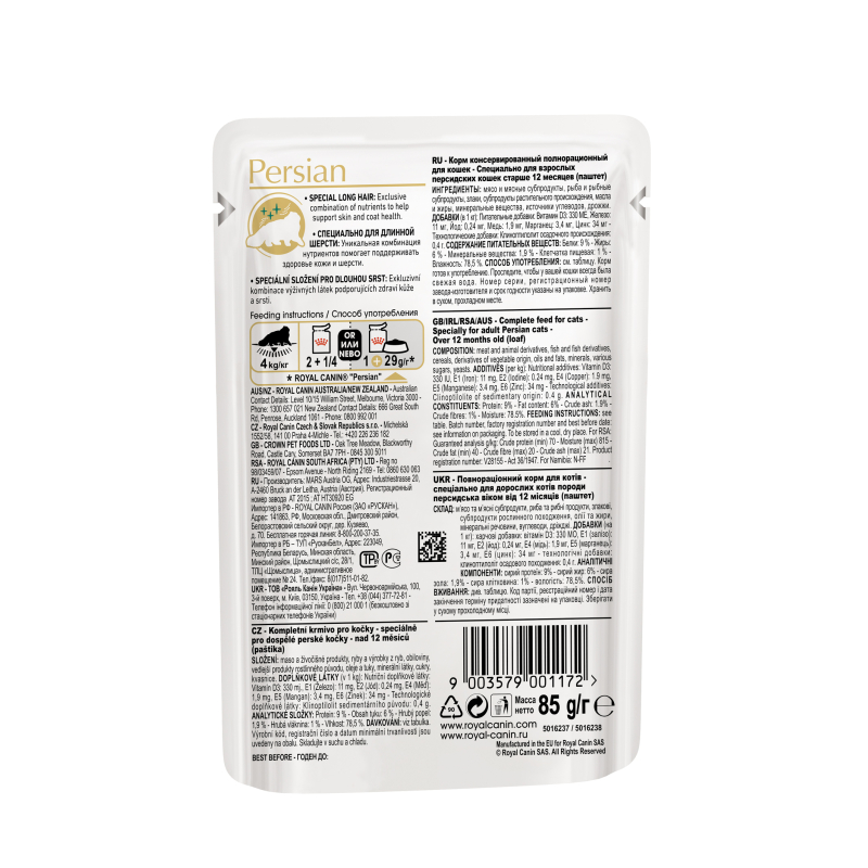 Известно, что у персидских кошек шерсть более длинная и густая, чем у любых других пород. Вот почему мы включили в продукт ROYAL CANIN® Persian Adult в форме паштета уникальную комбинацию нутриентов, поддерживающую барьерную функцию кожи. Это помогает коже оставаться здоровой и сохраняет красоту шерсти.
