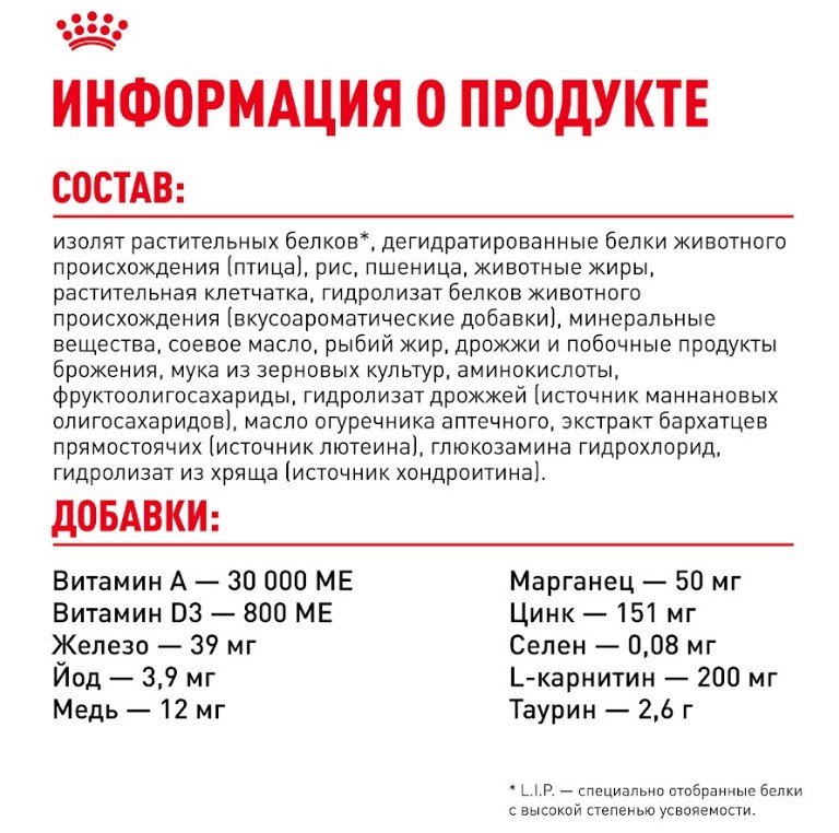 ИНГРЕДИЕНТЫ: изолят растительных белков*, дегидратированные белки животного происхождения (птица), рис, пшеница, животные жиры, растительная клетчатка, гидролизат белков животного происхождения (вкусоароматические добавки), мука из зерновых культур, рыбий жир, соевое масло, минеральные вещества, дрожжи и побочные продукты брожения, фруктоолигосахариды, гидролизат дрожжей (источник мaннановых олигосахаридов), масло огуречника аптечного, экстракт бархатцев прямостоячих (источник лютеина), гидролизат из панциря ракообразных (источник глюкозамина), гидролизат из хряща (источник хондроитина).