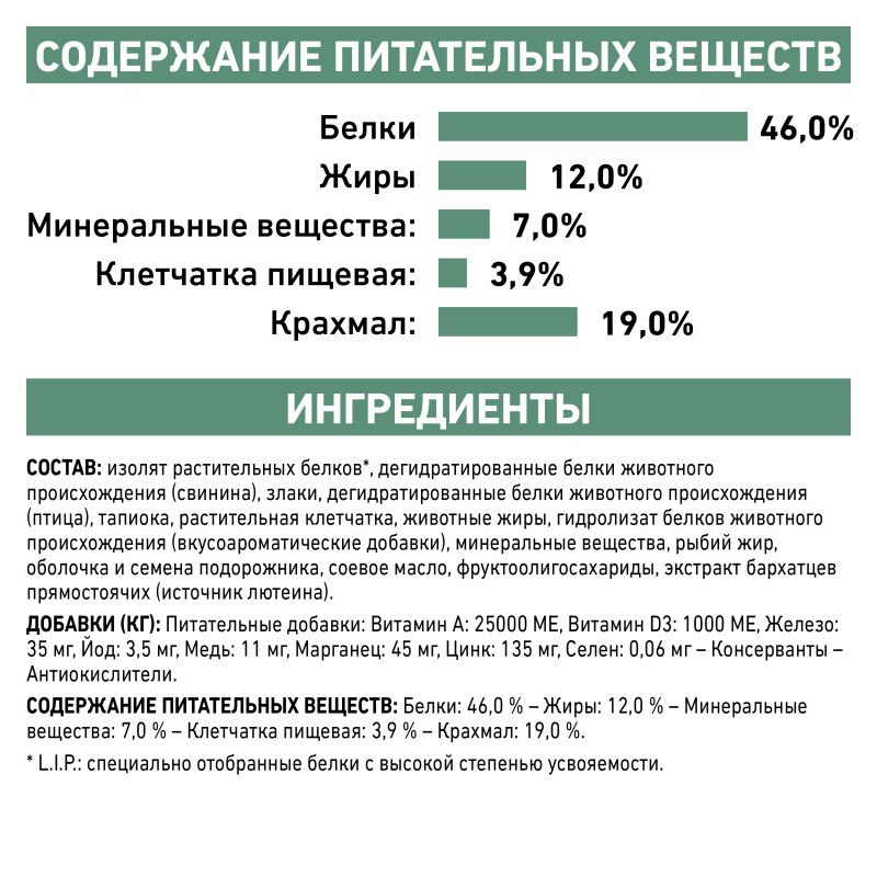 СОДЕРЖАНИЕ ПИТАТЕЛЬНЫХ ВЕЩЕСТВ: Белки: 46 % - Жиры: 12 % - Минеральные вещества: 6,2 % - Клетчатка пищевая: 3,6 % - Крахмал: 18,8 % - Незаменимые жирные кислоты: 3,18 % - Всего сахаров: 1,8 %.