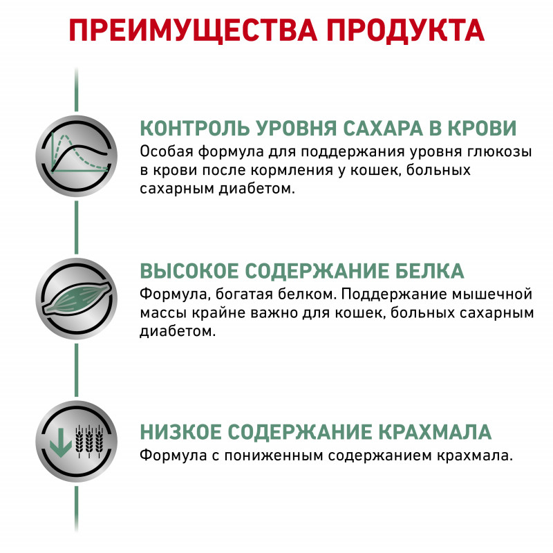 1) Контроль содержания сахаров: Специальная формула продукта, обеспечивающая контроль уровня постпрандиальной гликемии у кошек больных диабетом.