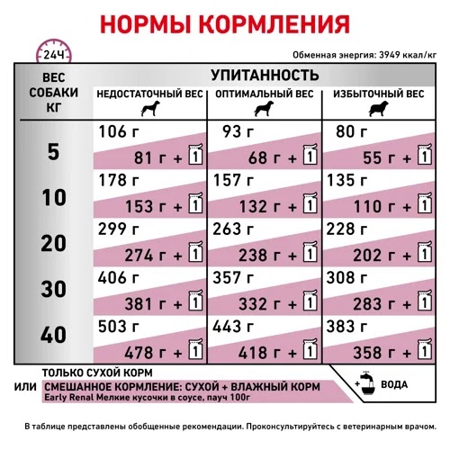 Рекомендации: посоветуйтесь с вашим ветеринарным врачом об употреблении или о продлении периода использования данного корма. Начальный курс применения сухого корма EARLY RENAL – до 6 месяцев в случае хронической почечной недостаточности.