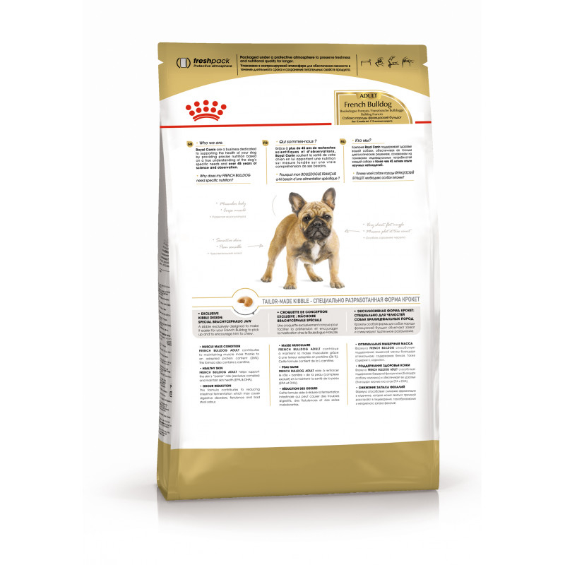 Корм ROYAL CANIN® French Bulldog Adult, подходящий для французских бульдогов старше 12 месяцев, специально разработан с учетом всех пищевых потребностей вашей взрослой собаки.