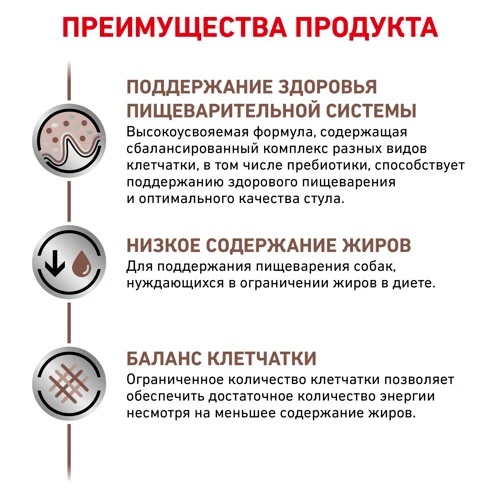 - низкое содержание жиров для поддержания пищеварения собак, нуждающихся в ограничении жиров в диете;