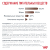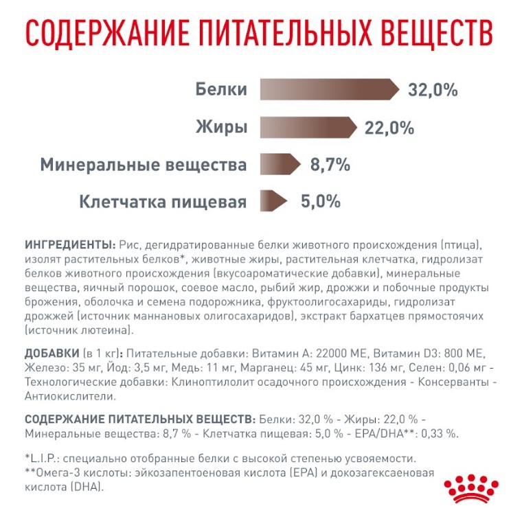 СОДЕРЖАНИЕ ПИТАТЕЛЬНЫХ ВЕЩЕСТВ: Белки: 32,0 % - Жиры: 22,0 % - Минеральные вещества: 8,7 % - Клетчатка пищевая: 5,0 % - EPA/DHA: 0,33 %.
