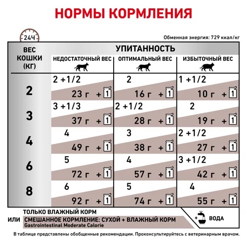 ROYAL CANIN® GASTROINTESTINAL MODERATE CALORIE (мелкие кусочки в соусе) – это полнорационный диетический корм для кошек, рекомендуемый при расстройствах пищеварения и для нормализации работы пищеварительной системы. Легкоусвояемые ингредиенты. Повышенное содержание электролитов. Пониженный уровень жиров. РЕКОМЕНДАЦИИ: Посоветуйтесь с вашим ветеринарным врачом по поводу целесообразности использования данного корма. Применяйте корм GASTROINTESTINAL MODERATE CALORIE (мелкие кусочки в соусе) в течение не менее 1-2х недель при острой диарее и в период восстановления. При синдроме недостаточности пищеварения – от 3 до 12 недель, при хронической экзокринной недостаточности поджелудочной железы – пожизненно.