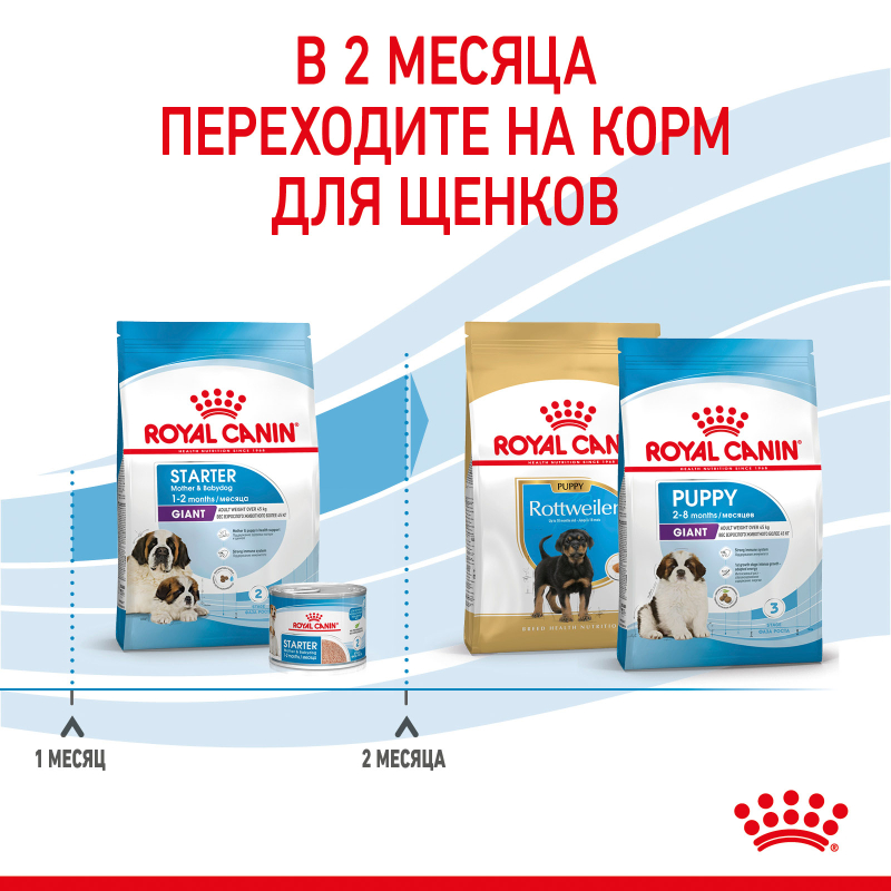 Через 8 недель потребности вашего щенка в питательных веществах изменятся. Ему будет необходим другой рацион, разработанный специально для следующей фазы роста. В этом возрасте вы сможете перевести своего питомца на сухой корм ROYAL CANIN® Giant Puppy, поддерживающий щенка в период интенсивного роста.