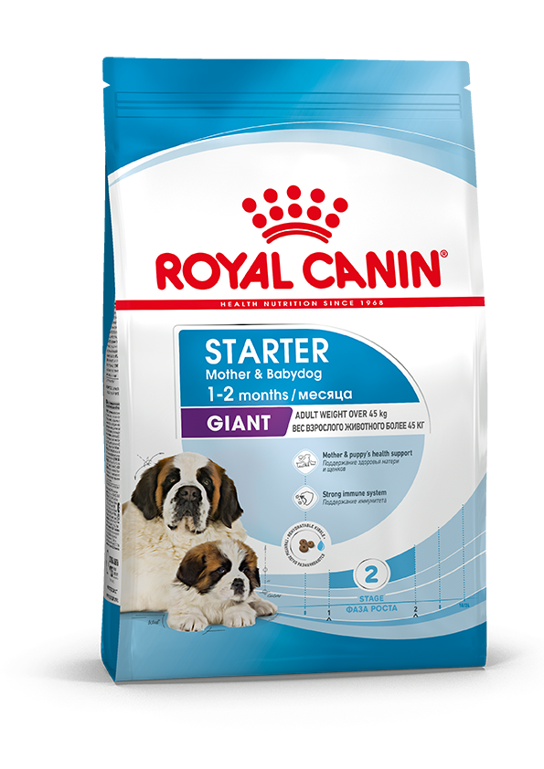 Продукт ROYAL CANIN® Giant Starter Mother & Babydog разработан с учетом потребностей в питательных веществах матери и ее новорожденных щенков. Эта формула подходит для взрослых крупных собак весом больше 45 кг, а также для щенков в возрасте до 2 месяцев.