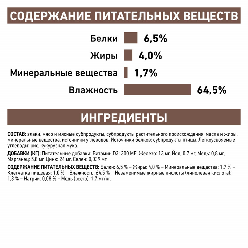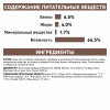 Состав: злаки, мясо и мясные субпродукты, субпродукты растительного происхождения, масла и жиры, минеральные вещества, источники углеводов. Источники белков: субпродукты птицы. Легкоусвояемые углеводы: рис, кукурузная мука.