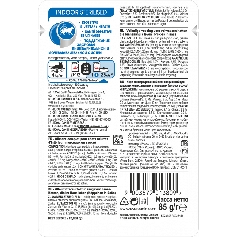 Влажный Корм Indoor Sterilised в соусе содержит белки с высокой усвояемостью (L.I.P.), оптимальный процент клетчатки и специальный комплекс нутриентов, стимулирующие пищеварение.
