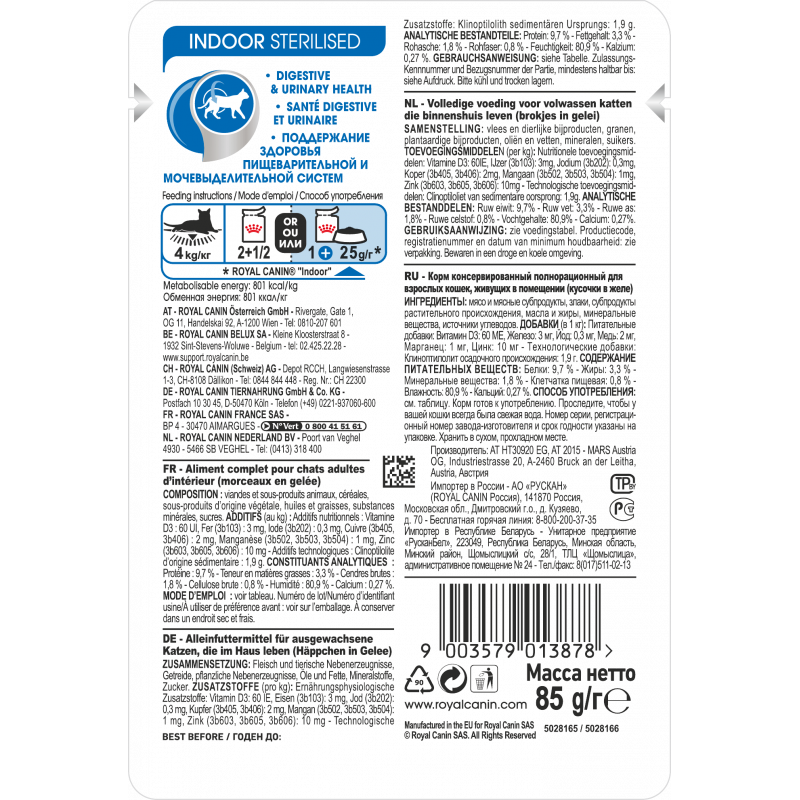Кроме того, Indoor Sterilised в желе включает в себя энергетическое соотношение белков, жиров и углеводов, интинктивно предпочитаемое большинством кошек, а низкая калорийность способствует чувству насыщения.