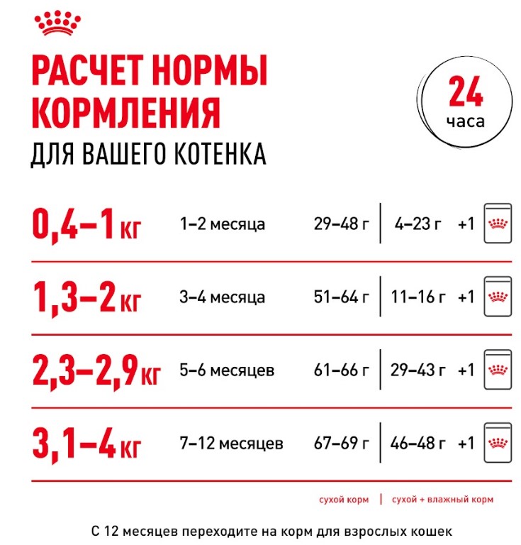 В возрасте 12 месяцев период роста подойдет к завершению, и потребности вашего котенка в питательных веществах изменятся. Ему будет необходим другой рацион, разработанный специально для взрослых кошек. В этом возрасте вы сможете перевести своего питомца на продукты ROYAL CANIN® для взрослых кошек – сухой корм или влажные рационы, такие как паштет, кусочки в соусе или желе.