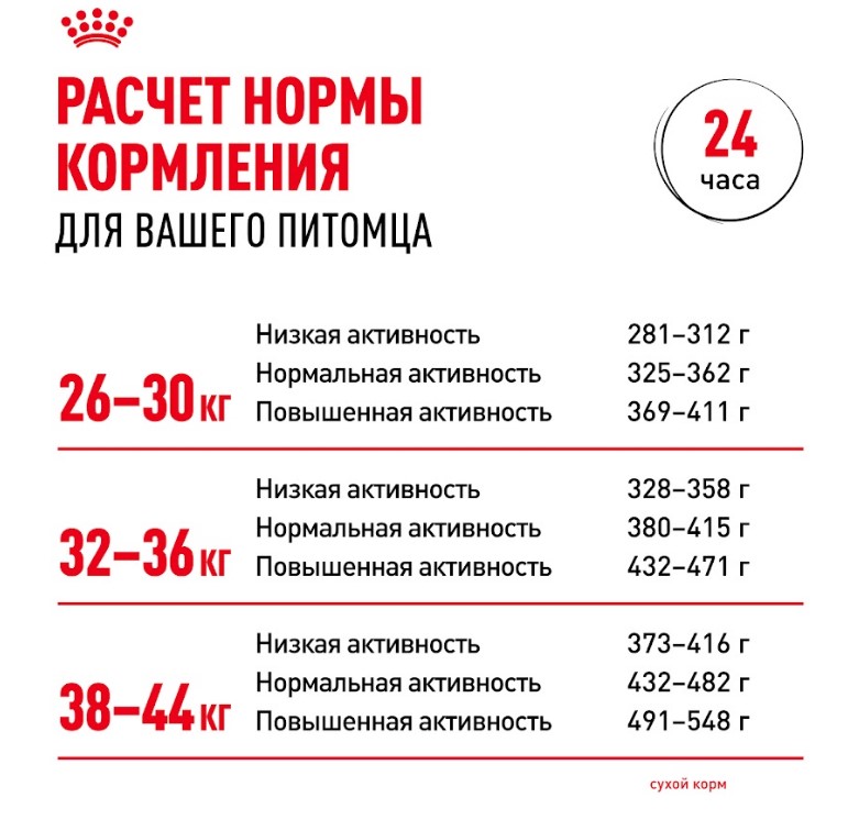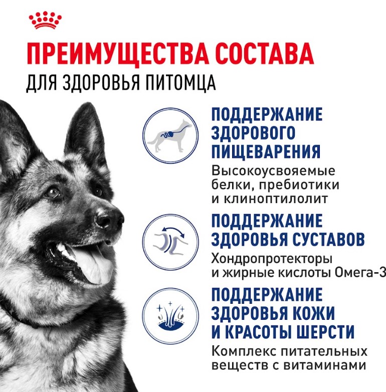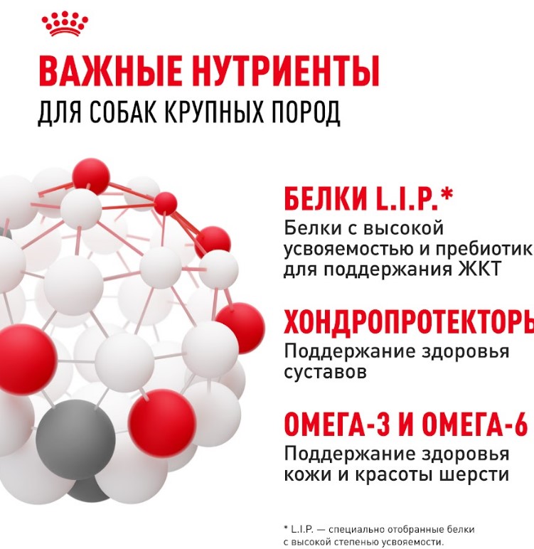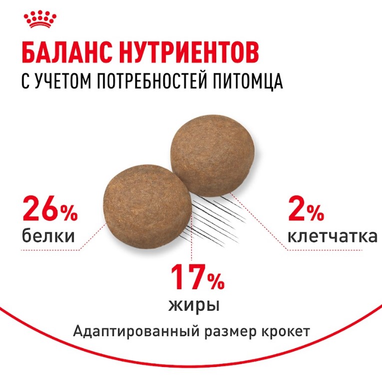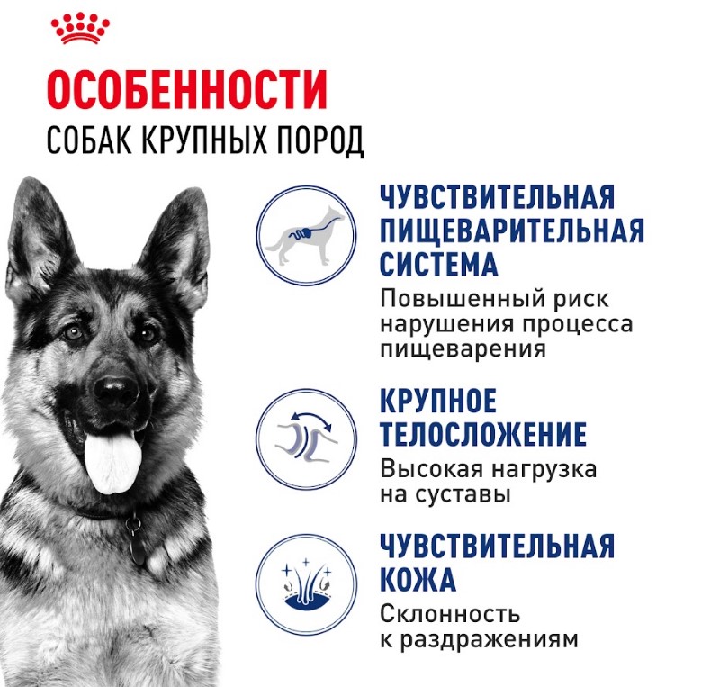Потребности в питательных веществах собак крупных и мелких пород существенно различаются. Важно подобрать для собаки рацион с учетом ее размеров и связанных с ними физиологических особенностей. Продукт ROYAL CANIN® Maxi Adult предназначен для крупных собак (вес взрослой собаки от 26 до 44 кг) в возрасте от 15 месяцев и разработан с учетом их потребностей в питательных веществах.