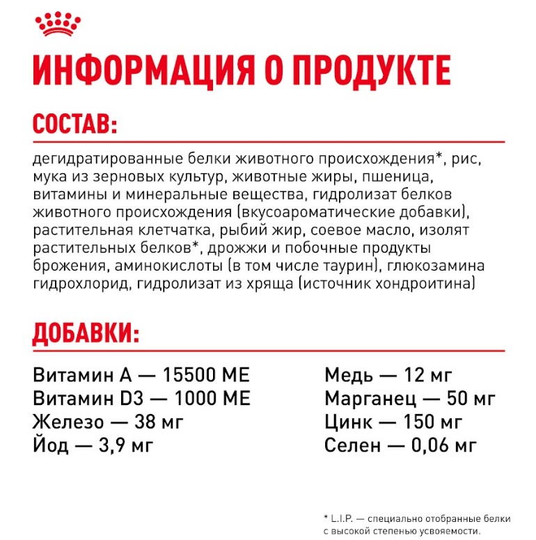 ИНГРЕДИЕНТЫ: мука из зерновых культур, рис, дегидратированные белки животного происхождения (свинина), дегидратированные белки животного происхождения (птица), животные жиры, пшеница, изолят растительных белков*, гидролизат белков животного происхождения (вкусоароматические добавки), растительная клетчатка, минеральные вещества, рыбий жир, соевое масло, дрожжи и побочные продукты брожения, гидролизат из панциря ракообразных (источник глюкозамина), гидролизат из хряща (источник хондроитина).