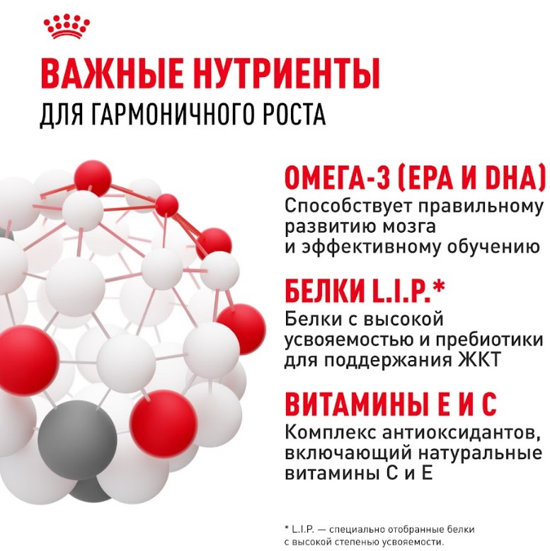 Этот продукт также поддерживает формирование здоровой иммунной системы щенка за счет содержания питательных веществ с научно доказанной эффективностью, таких как витамины С и Е. Специально разработанный рацион обогащен полиненасыщенной жирной кислотой Омега-3 (ДГК), которая, как научно доказано, поддерживает развитие мозга щенка.