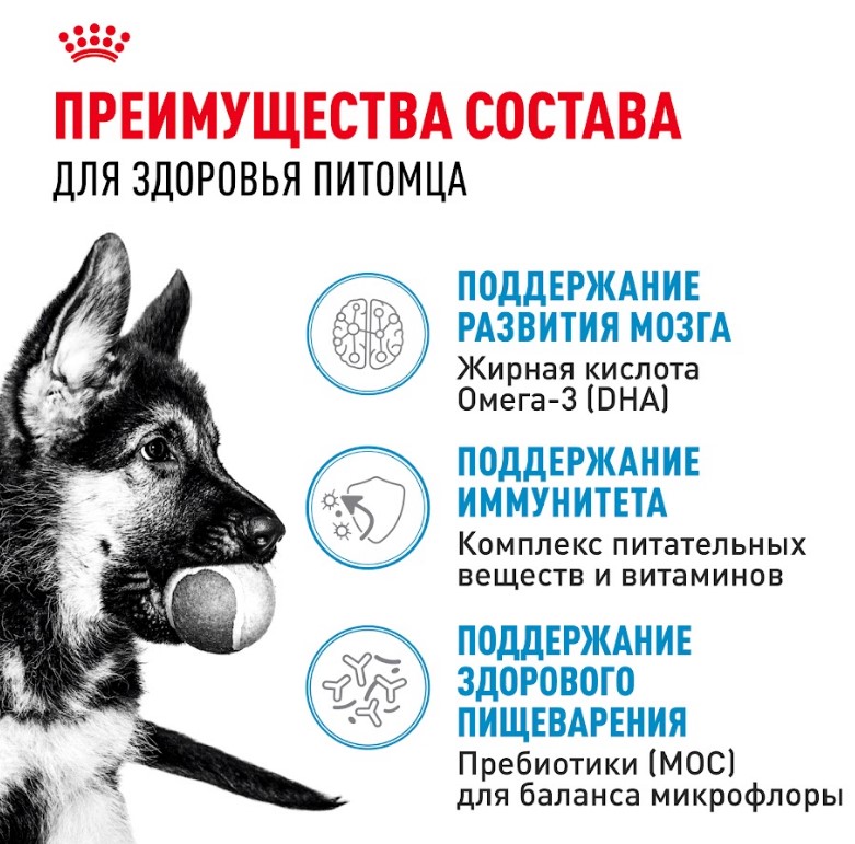 Благодаря сочетанию пребиотиков (МОС) и легкоусвояемых белков, формула ROYAL CANIN® Maxi Puppy поддерживает баланс микрофлоры кишечника, способствуя здоровому пищеварению.