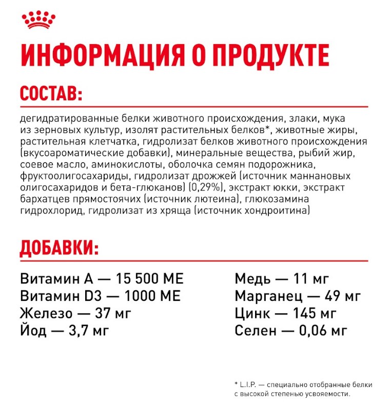 ИНГРЕДИЕНТЫ: дегидратированные белки животного происхождения, злаки, мука из зерновых культур, изолят растительных белков*, животные жиры, растительная клетчатка, гидролизат белков животного происхождения (вкусоароматические добавки), минеральные вещества, рыбий жир, соевое масло, аминокислоты, оболочкa семян подорожника, фруктоолигосахариды, гидролизат дрожжей (источник мaннановых олигосахаридов и бета-глюканов) (0,29 %), экстракт юкки, экстракт бархатцев прямостоячих (источник лютеина), глюкозамина гидрохлорид, гидролизат из хряща (источник хондроитина).