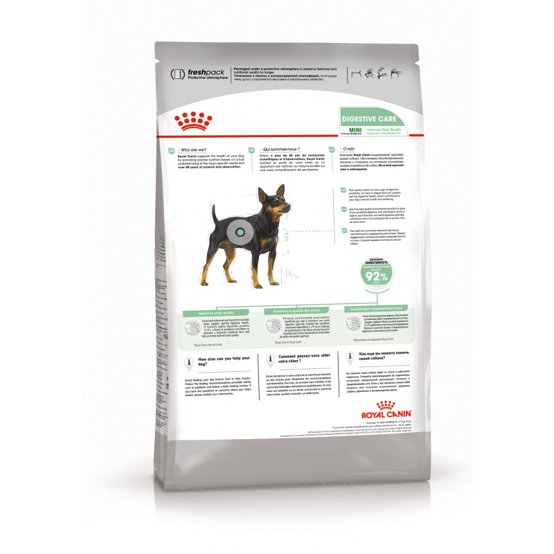 Корм ROYAL CANIN® Digestive Care Mini имеет доказанную эффективность. ROYAL CANIN® было проведено исследование, согласно которому до 92% владельцев заметили улучшение качества стула собаки, что свидетельствует о нормализации общего состояния желудочно-кишечного тракта.