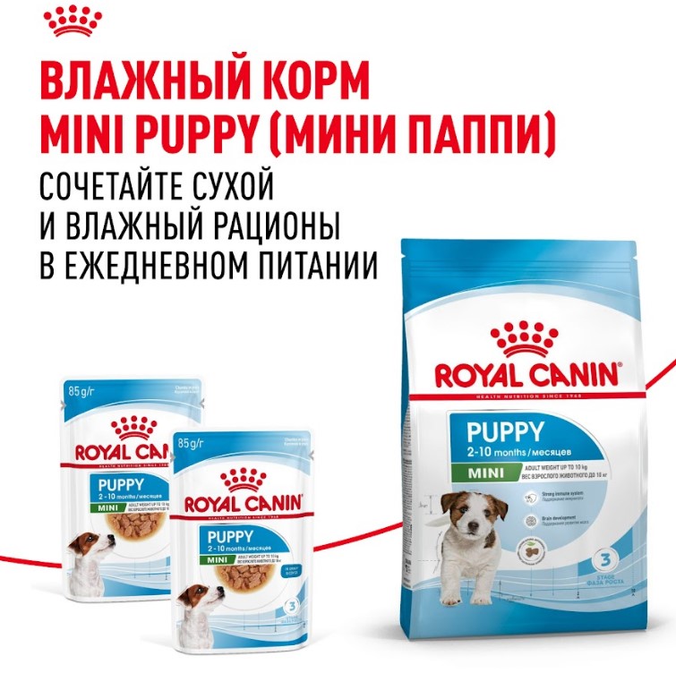 Продукт ROYAL CANIN® Mini Puppy разработан с учетом потребностей в питательных веществах щенков мелких размеров (вес взрослой собаки от 4 до 10 кг) в возрасте от 2 до 10 месяцев.