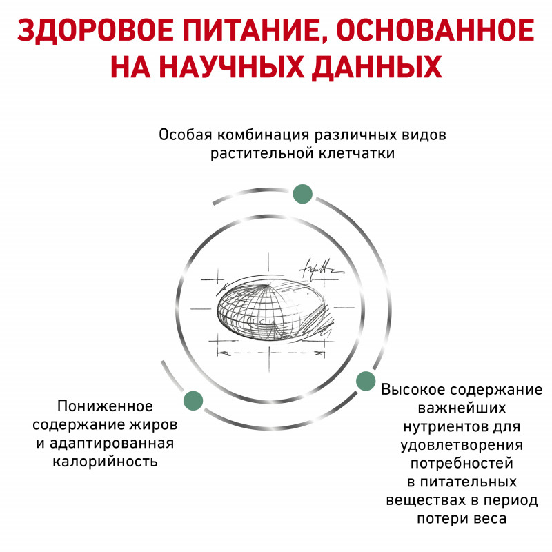 2) Высокое содержание белка: Высокое содержание белка в корме (111 г/1000 ккал МЭ) сокращает потери мышечной массы животного в период снижения веса.