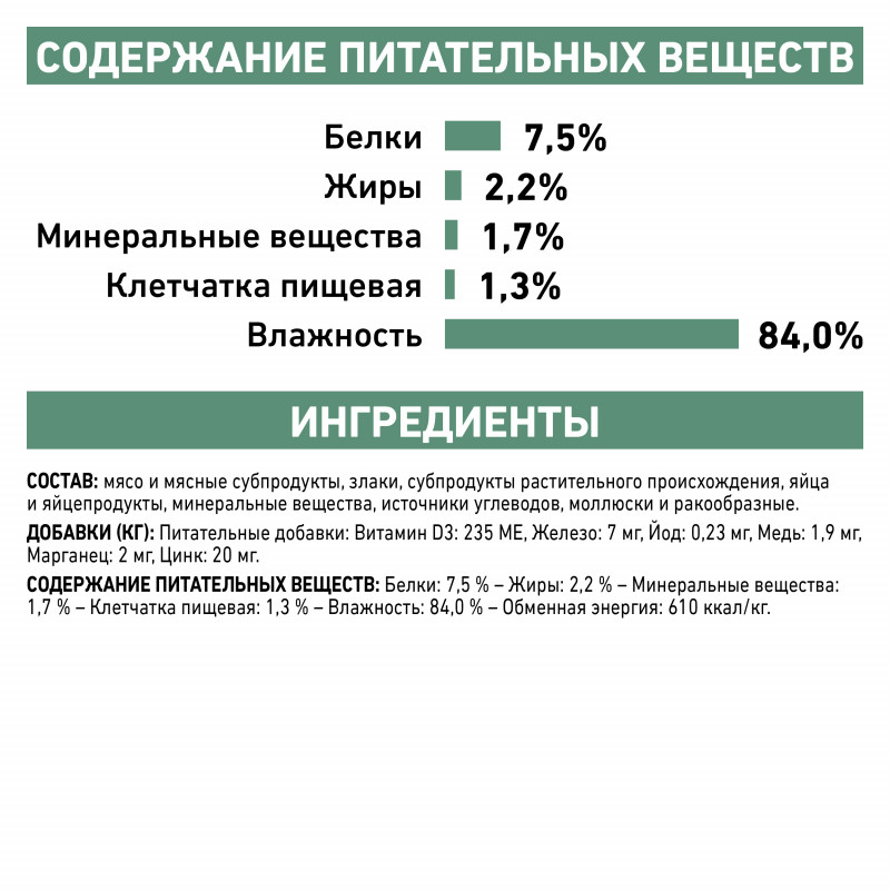 ИНГРЕДИЕНТЫ: мясо и мясные субпродукты, злаки, субпродукты растительного происхождения, яйца и яйцепродукты, минеральные вещества, источники углеводов, моллюски и ракообразные.