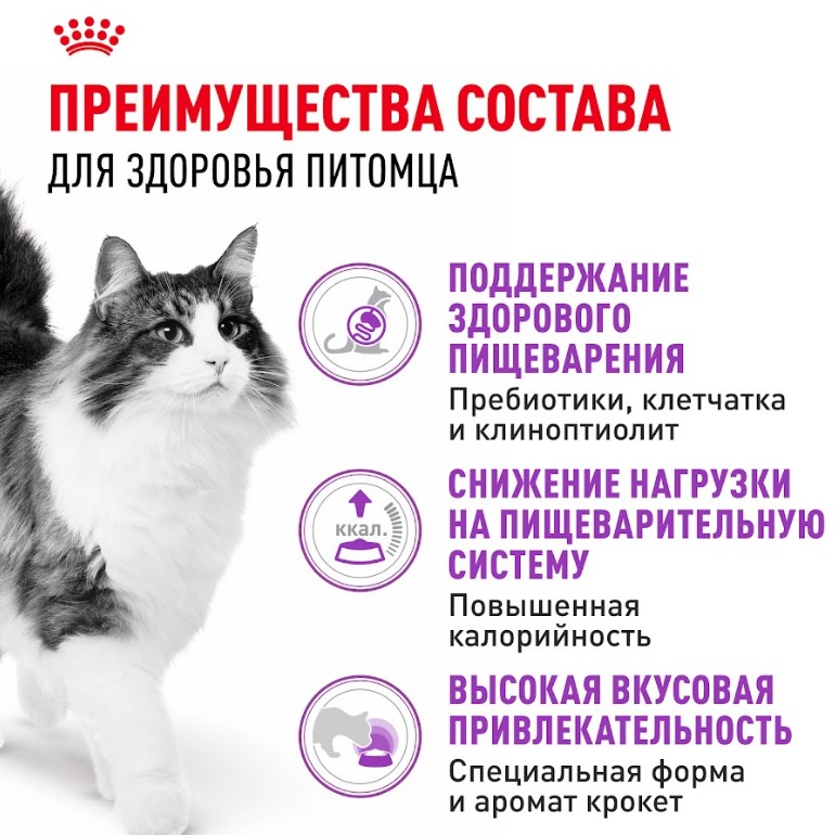 2) Повышенная вкусовая привлекательность: три различные формы крокет и тщательно подобранные ароматические добавки стимулируют аппетит у кошек с повышенной чувствительностью пищеварительной системы;