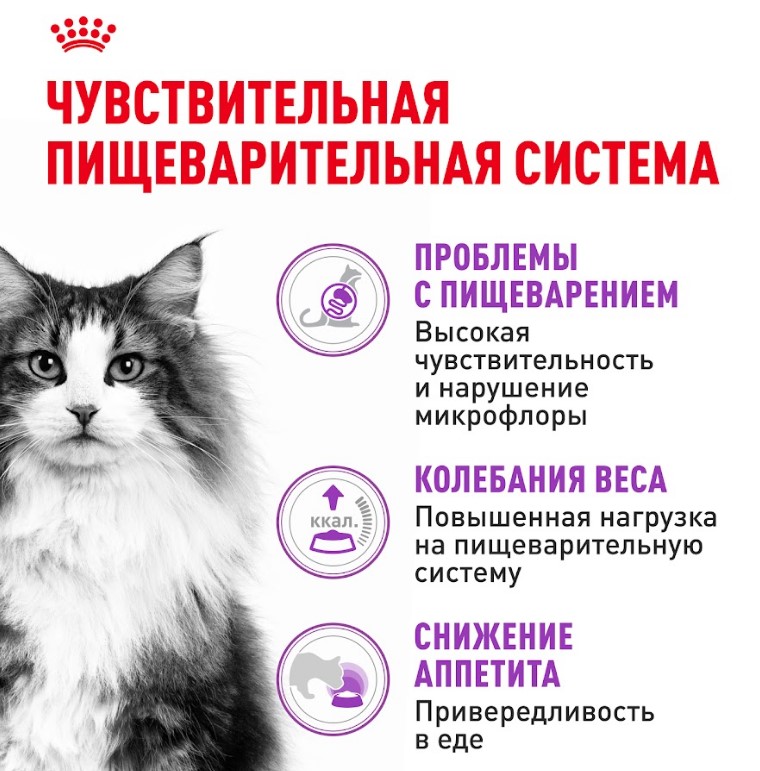 2) Повышенная вкусовая привлекательность: три различные формы крокет и тщательно подобранные ароматические добавки стимулируют аппетит у кошек с повышенной чувствительностью пищеварительной системы;