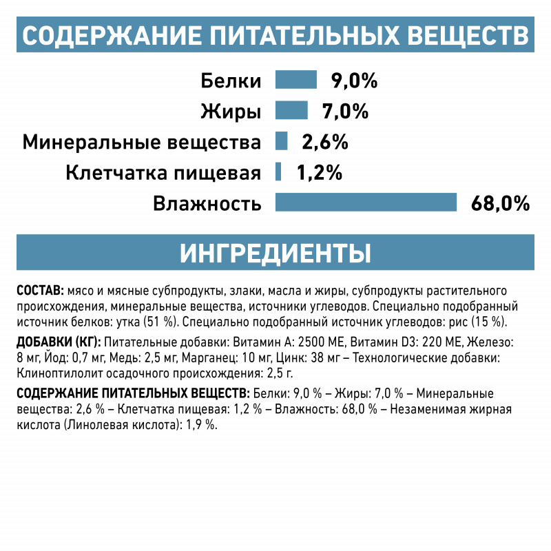 ИНГРЕДИЕНТЫ: мясо и мясные субпродукты, злаки, масла и жиры, субпродукты растительного происхождения, минеральные вещества, источники углеводов. Специально подобранный источник белков: утка (51 %). Специально подобранный источник углеводов: рис (15 %).
