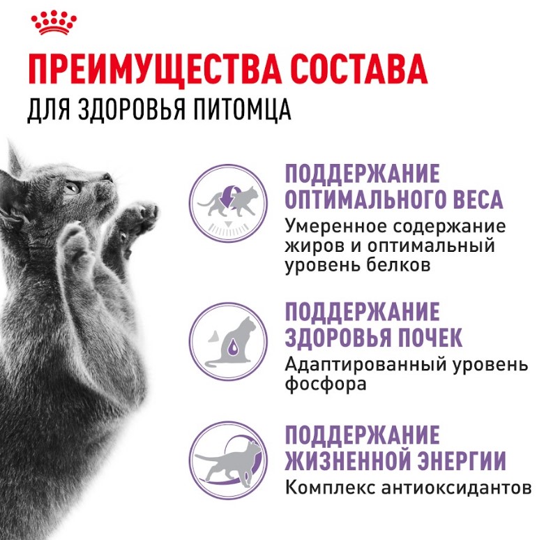 Продукт ROYAL CANIN® Sterilised 7+ разработан специально для стерилизованных кошек старше 7 лет с учетом их особых потребностей в питательных веществах.